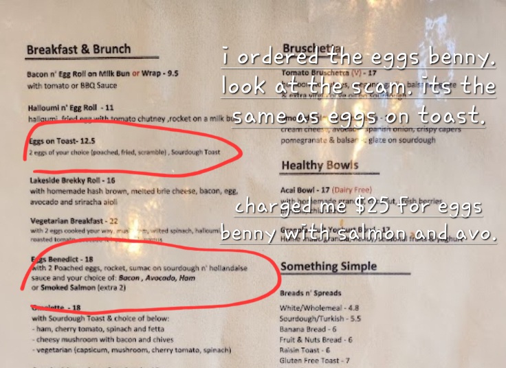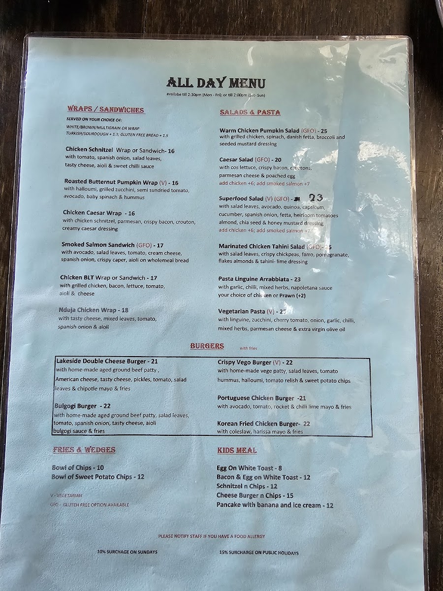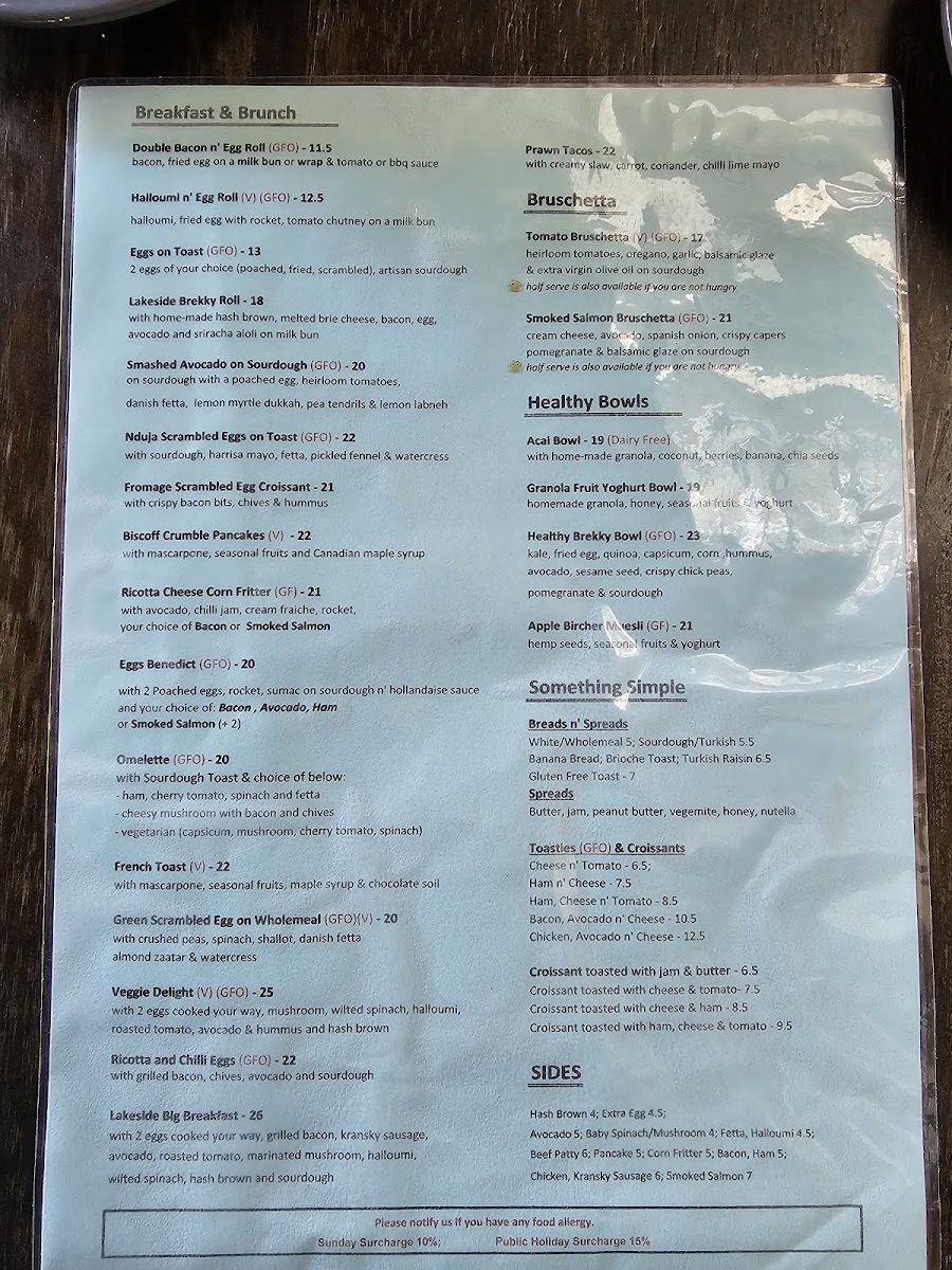 The breakfast offerings are a true highlight, with the Fromage Scrambled Egg Croissant garnished with crispy bacon bits, and the decadent Lakeside Brekky Roll promising a symphony of flavors. For a lighter option, the Smashed Avocado on Sourdough provides a fresh, satisfying start to your day.